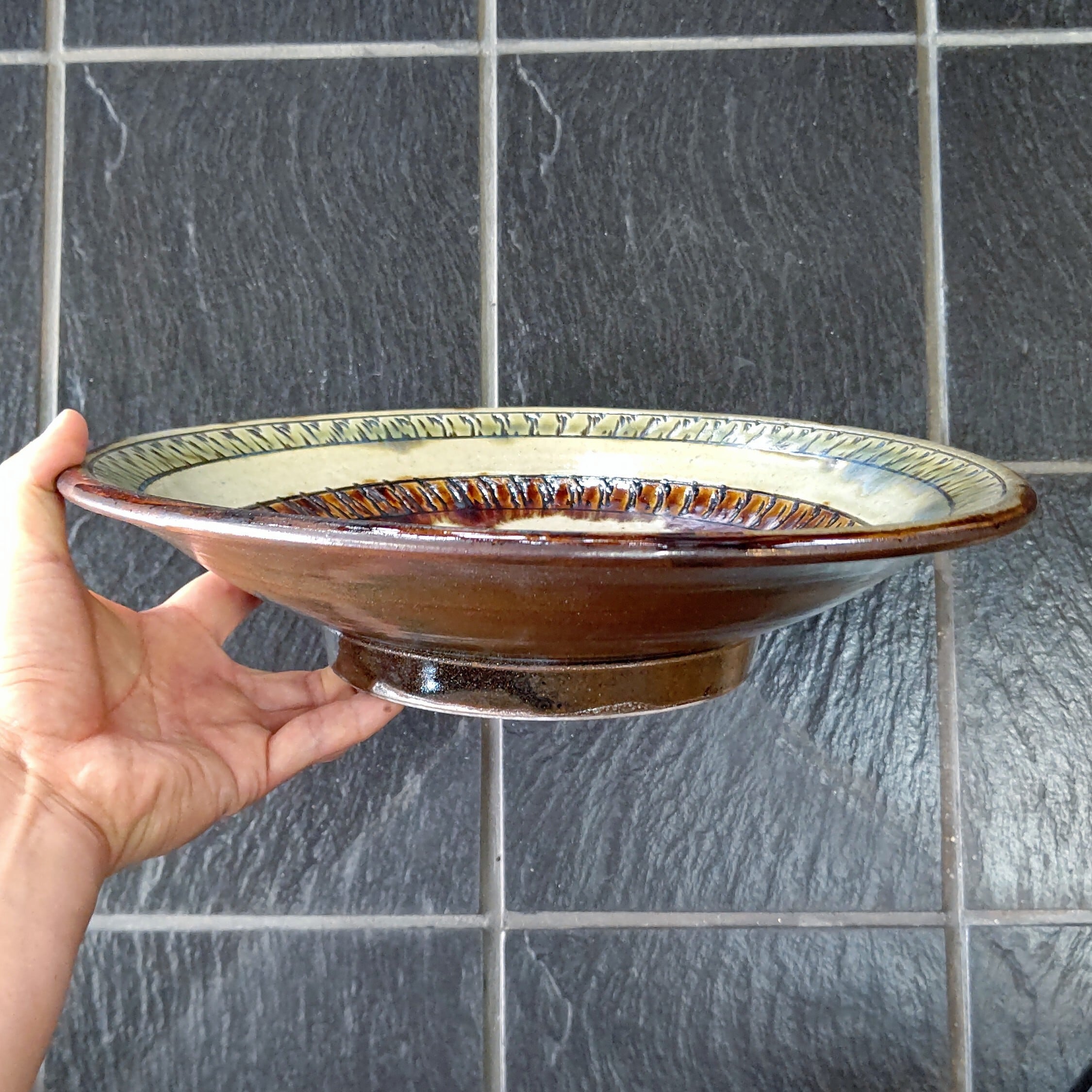 手仕事で素朴に作られたものですので、多少の歪みなどはご了承くださいませ。また登り窯焼成のため小さな火ぶくれや灰の降り物なども付着している場合がございます。壁に掛けて飾れるよう高台に穴が開けられています。